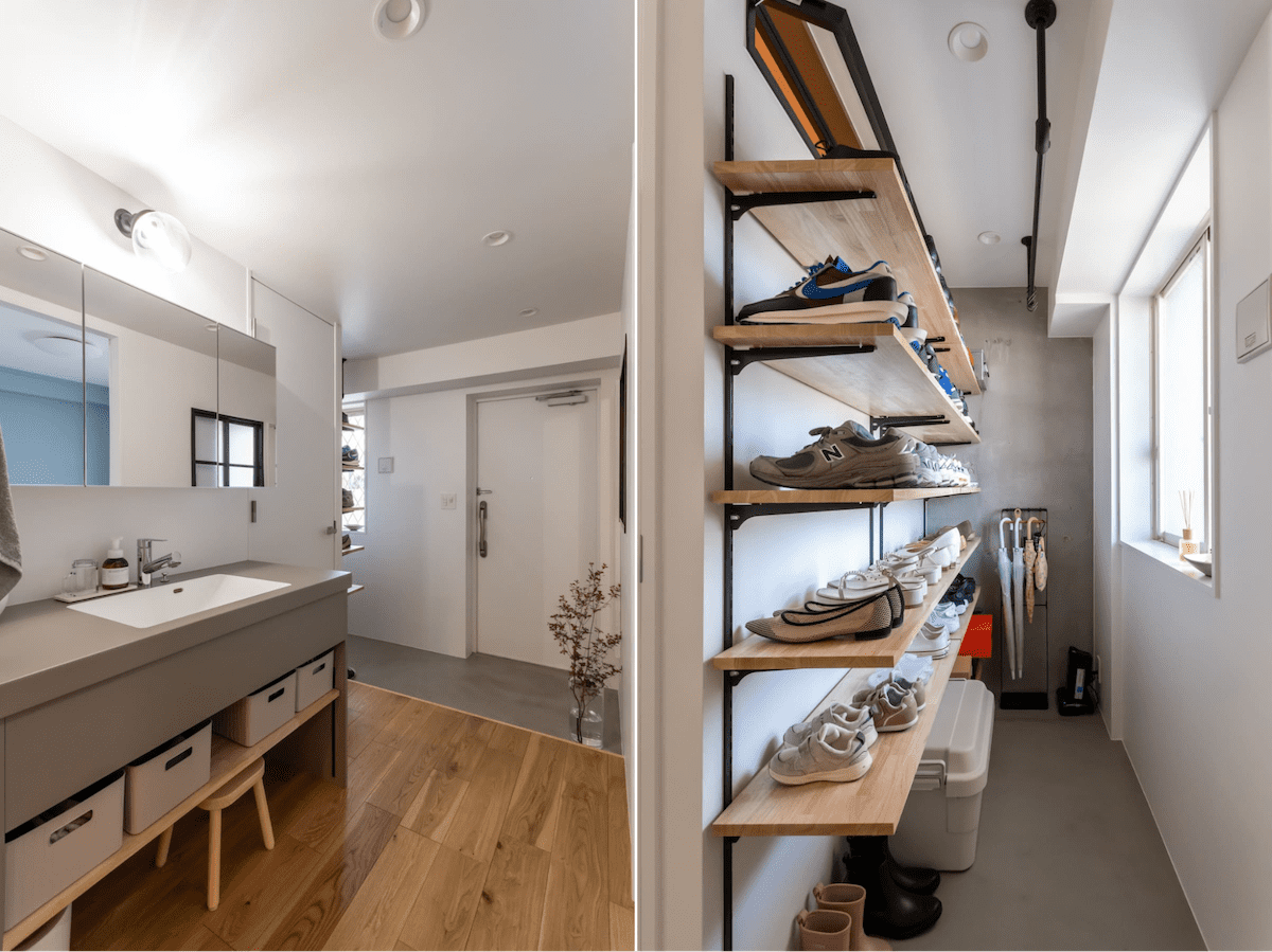 玄関土間を広くとると、ベビーカーやアウトドアグッズなど外から持ち帰ったものをすぐにしまえます。玄関付近に洗面台をつくれば、すぐに手洗いができて衛生的にも気持ちがいいですよ。