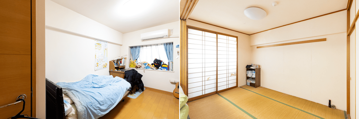 玄関側には個室が2つ。広いほうは6.8帖と十分なスペース。和室も6帖と広く、個室運用しやすい