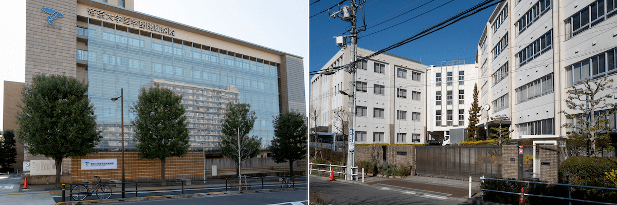 大学の横には付属の病院、マンションの目の前が帝京中高等学校