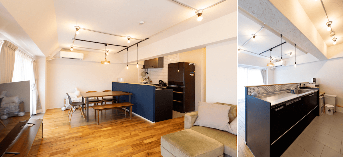 前回のリノベーションで交換された設備を活かしつつ、キッチンの腰壁のアクセントカラーを変えるだけでもガラッと印象が変わりますよ。