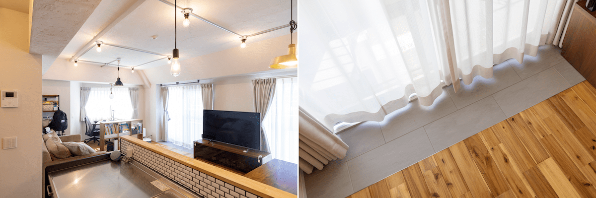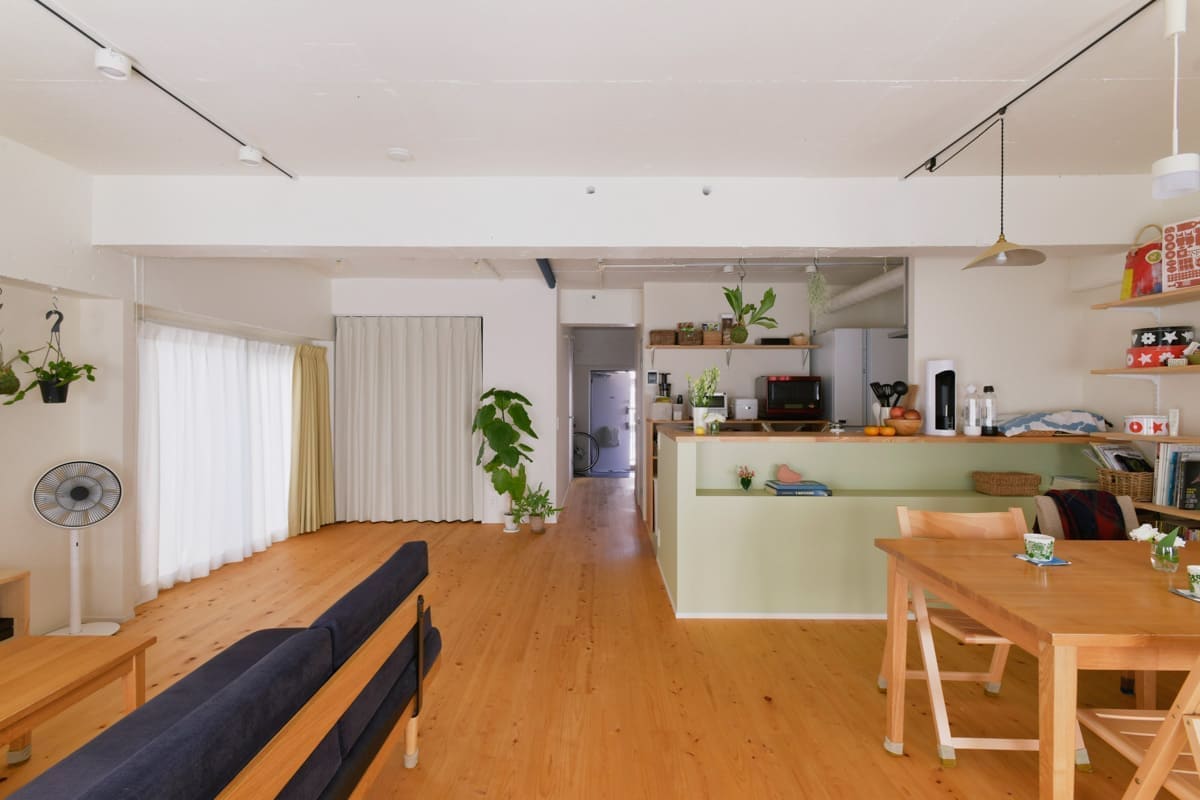 リノベーションでは、来客を見込んでリビングを広くすることと、壁は塗装にすること、あとフローリングに無垢材を使うことは絶対と決めてました。リビングの形を縦長にする案もあったんですけど、日当たりの良さを重視して南と南西の窓を活かした横長の間取りを選びました。