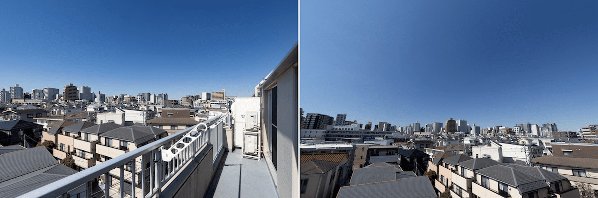 洗濯物を干すには充分な広さ。高い建物は遠くにあるので景観も良い