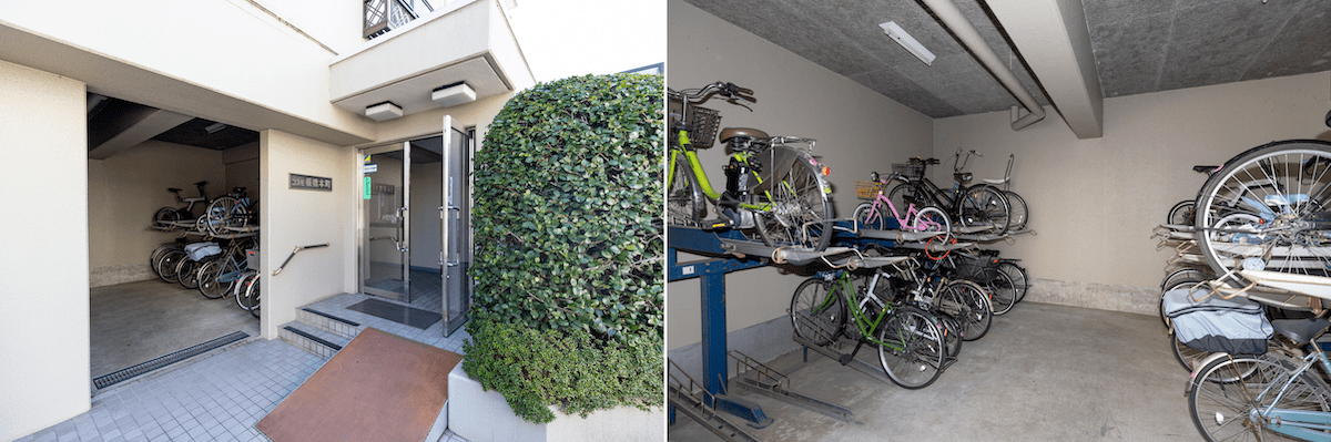 清潔に整えられた風情のあるエントランス。自転車置場はエントランス横とゴミ置き場の前に設けられている