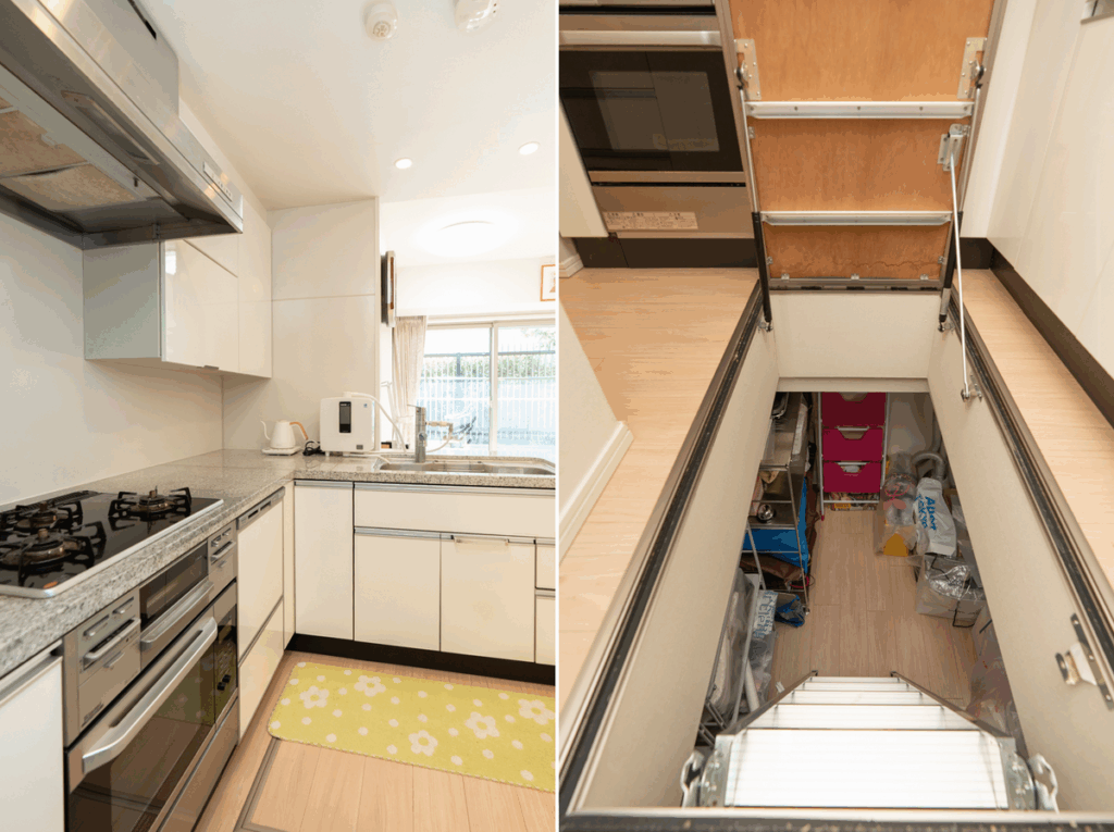 床板を開けるとまるで秘密基地のような収納空間が広がっていて、季節物の調理家電、災害備蓄、まとめ買いした食品、使っていない食器類まで、何でもしまえる大容量。中は立って移動できるほどの高さがあり、棚や引き出しをうまく使えばかなり整理整頓できます。