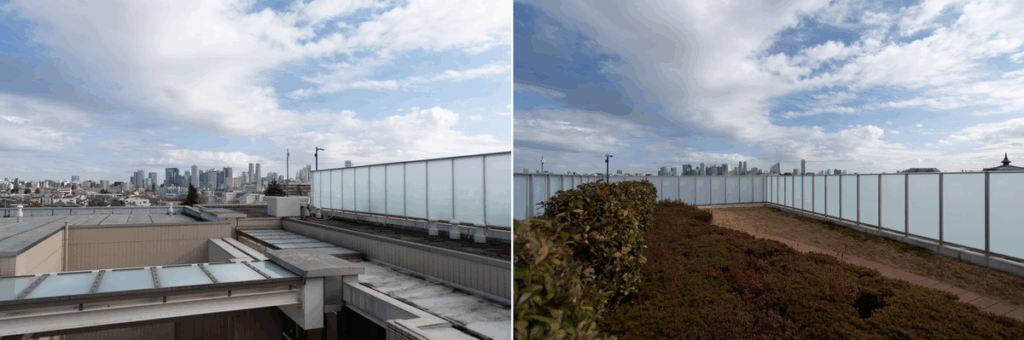 広々とした開放感に加えて、視界を遮るものがないので、空がぐっと近く感じられる贅沢な場所ですね。都心のビル群まで見渡せるほどの眺望で、日中はもちろん、夕焼けや夜景もきっときれいですね!