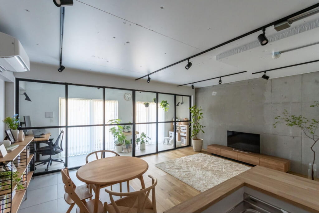 インナーバルコニーをつくることで、植物の水やりがしやすくなり、室内の暖房効率も高まります。LDKから緑が見える“抜け”も生まれて、日常の心地よさが底上げされます。