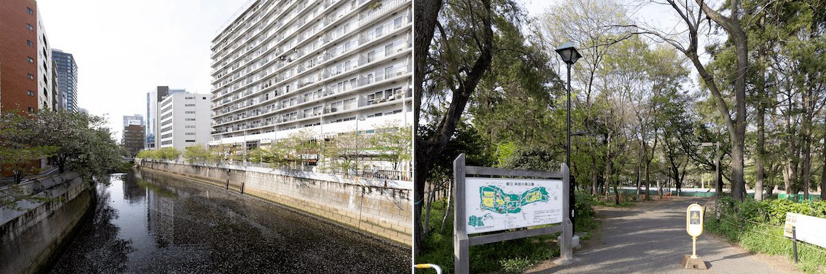 春には桜が咲き乱れる目黒川。都心であることを感じさせない林試の森公園