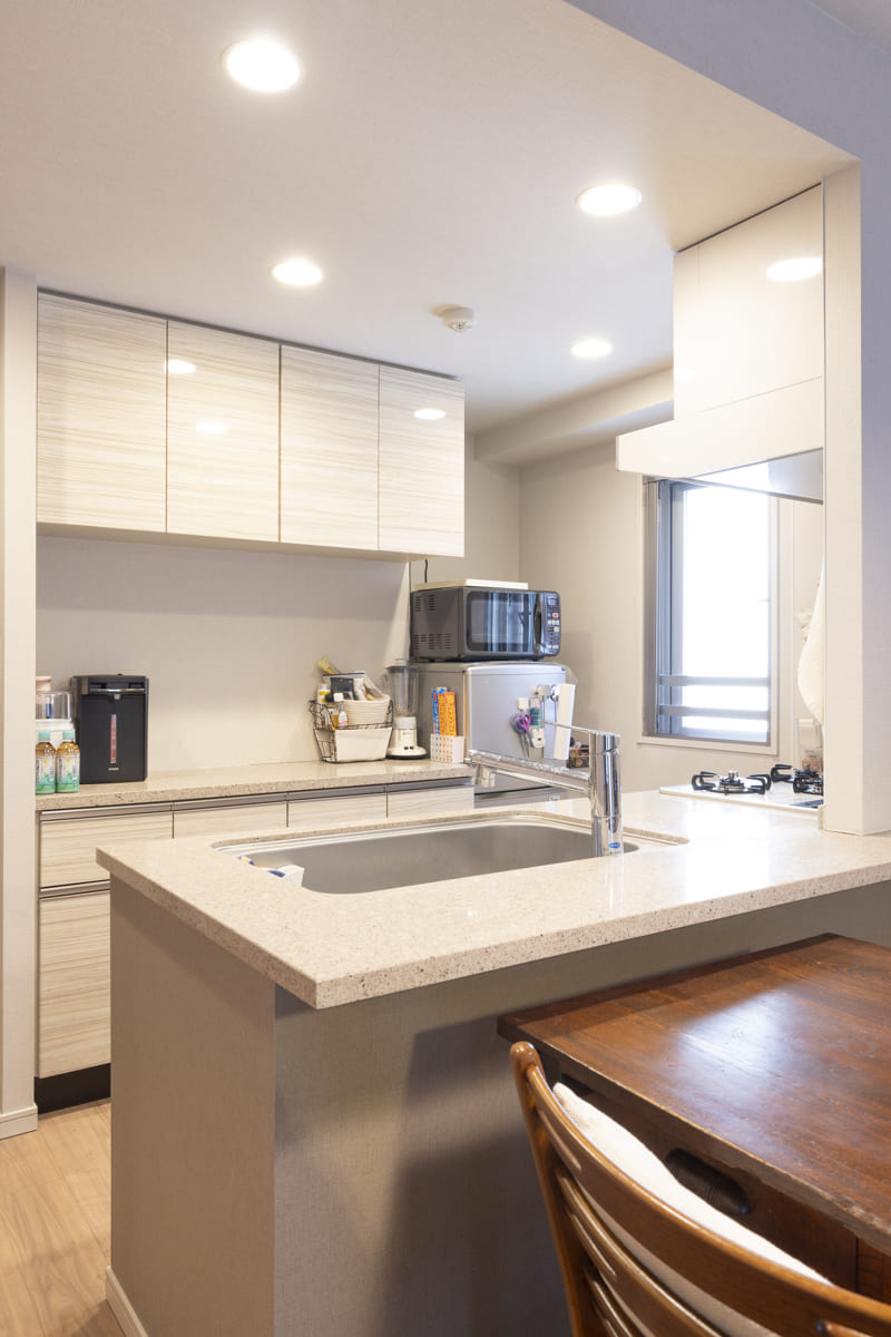 キッチンはカウンタータイプ。角部屋で窓付きとなるため、明るく通気性も良い
