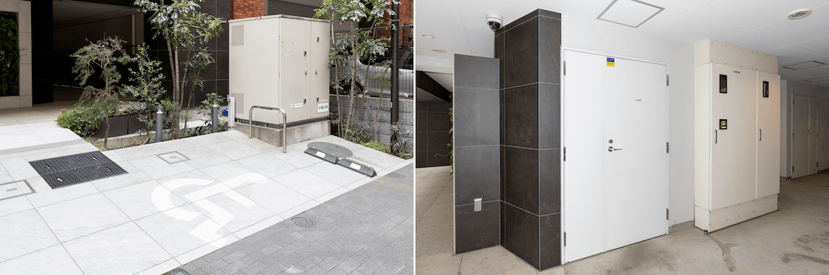 マンション入り口側に平置きの駐車場を設置。敷地内のゴミ置き場は24時間いつ出してもOK