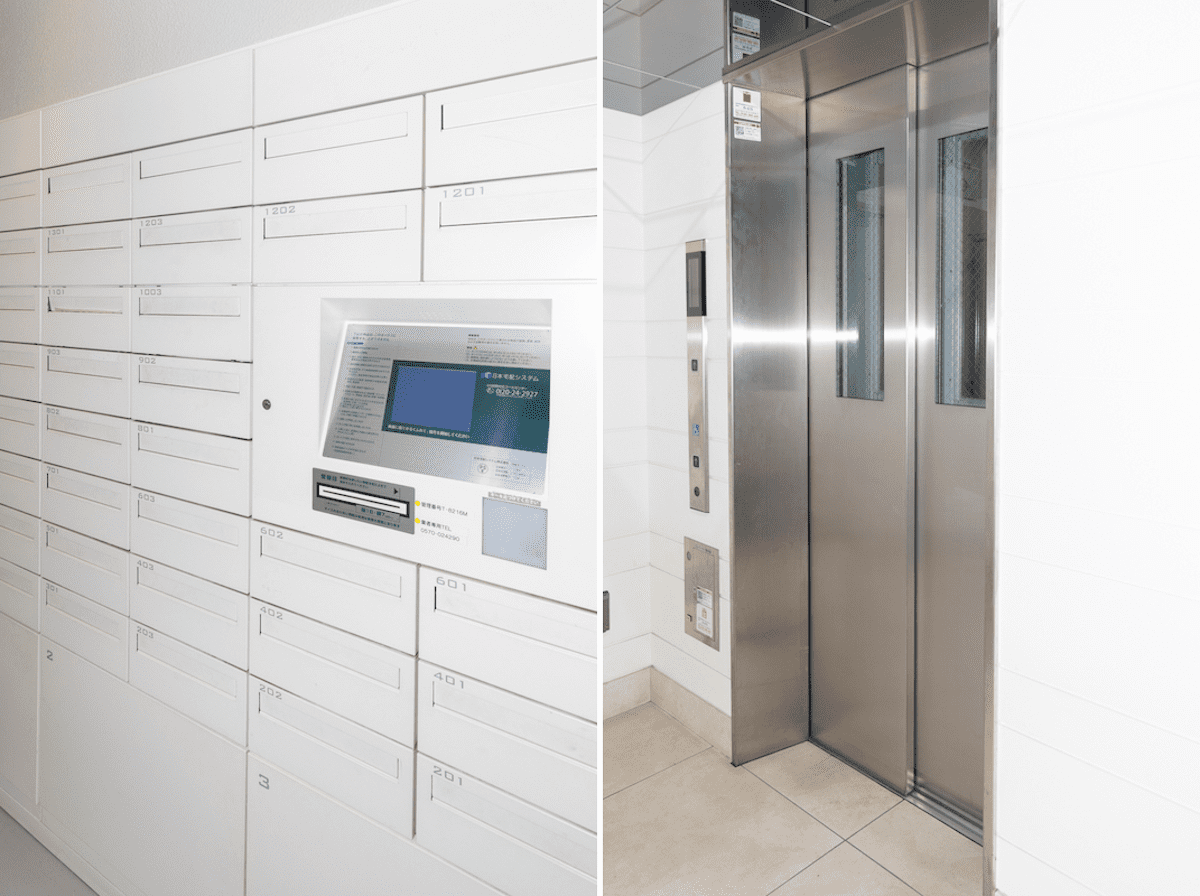 宅配ボックス付き。エレベーターは一基だが、戸数の少ないマンションなので待ち時間は少ない