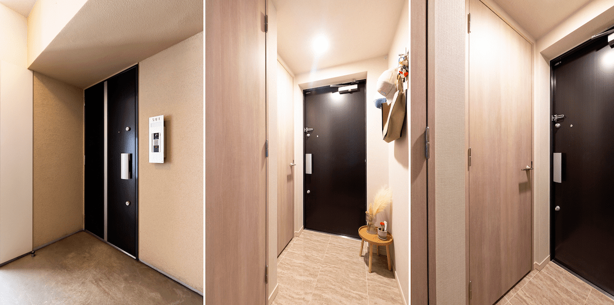 長方形の物件は、玄関から室内が見えてしまいがち。そんな時は、お部屋の中心に空間を設けて迂回する動線をつくれば解決します。