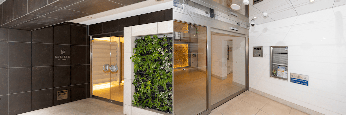 きれいに整えられたエントランス。オートロックのすぐ横に管理人室の窓があり安心感がある