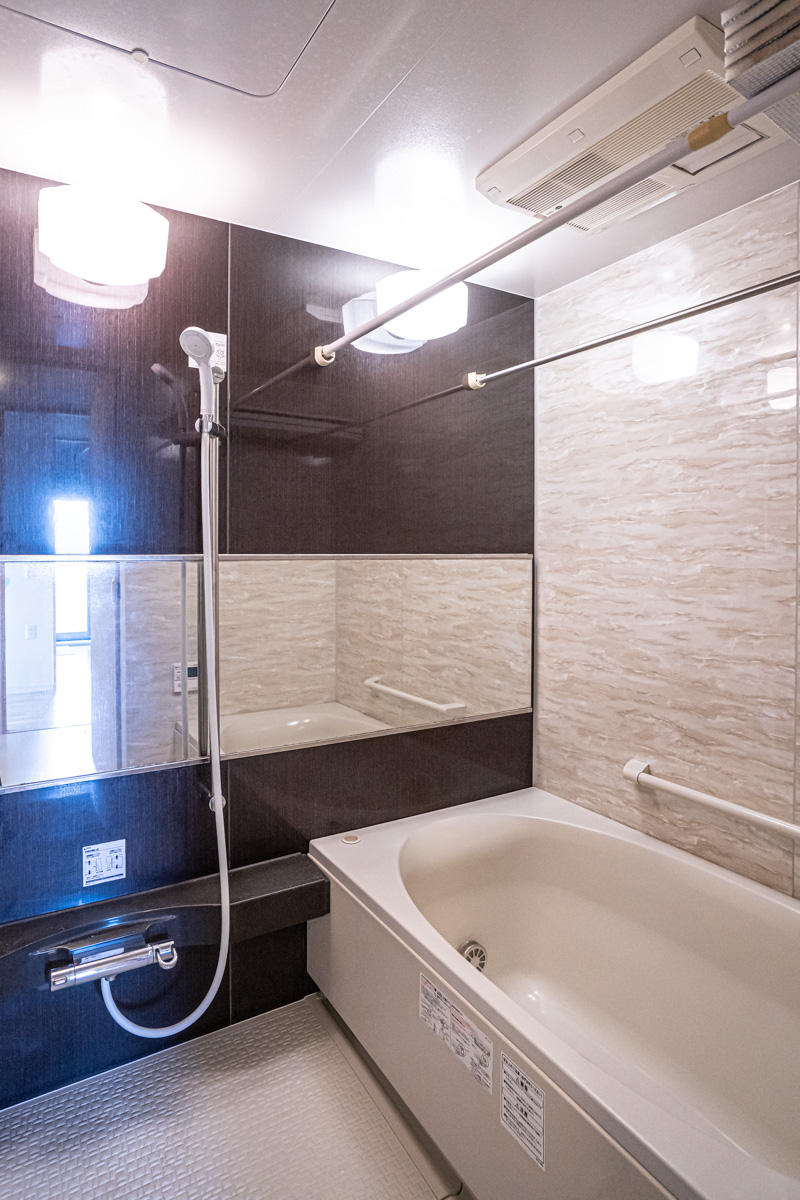 大きな鏡がついた浴室は乾燥室としても活躍しそう