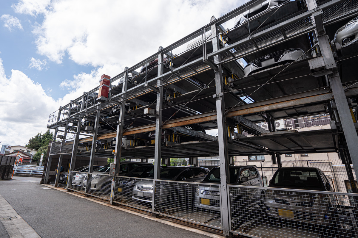 駐車場は2タイプの機械式で、うちが契約しているのは5段(地下1段、地上4段)の最上段です。一番上なので昇降に時間が多少かかりますが、車高制限はありませんし、道路側なので出し入れもしやすいです。