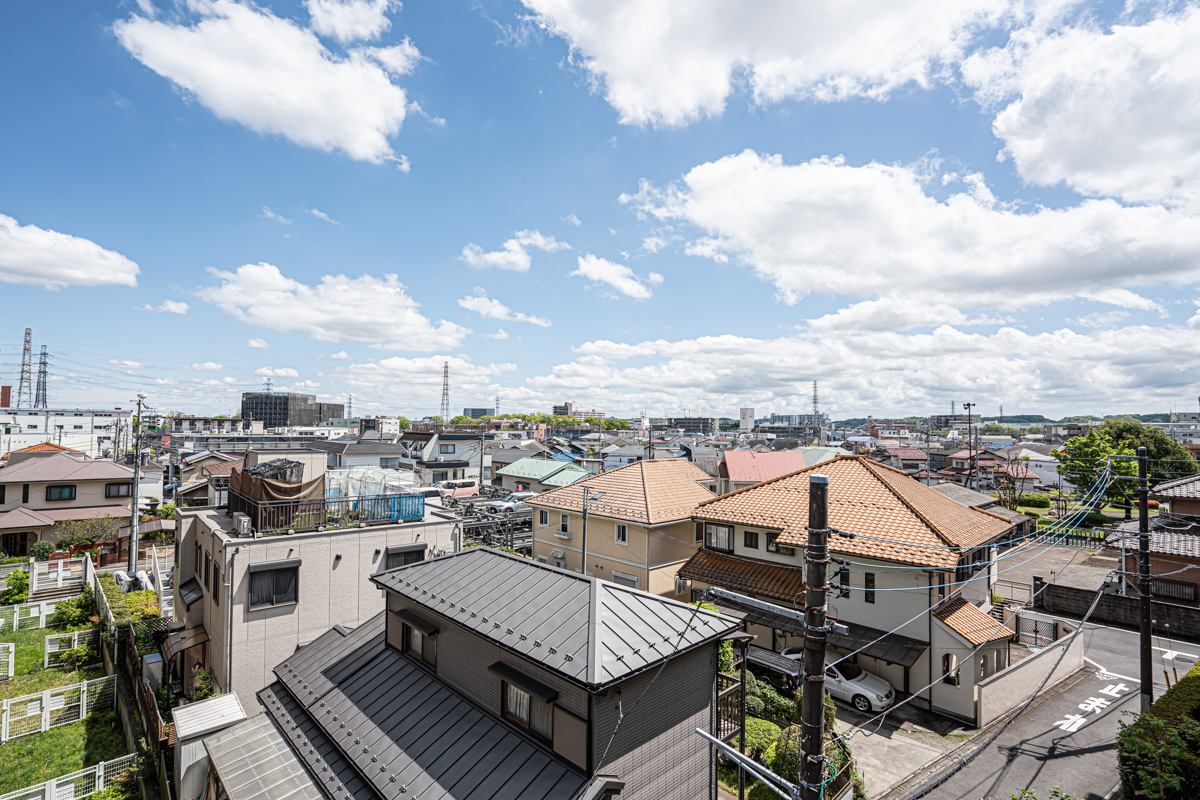 リビング正面のバルコニーからの眺め。低層階の戸建住宅が多く抜けがある