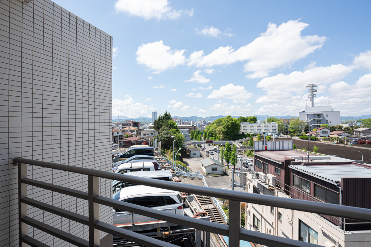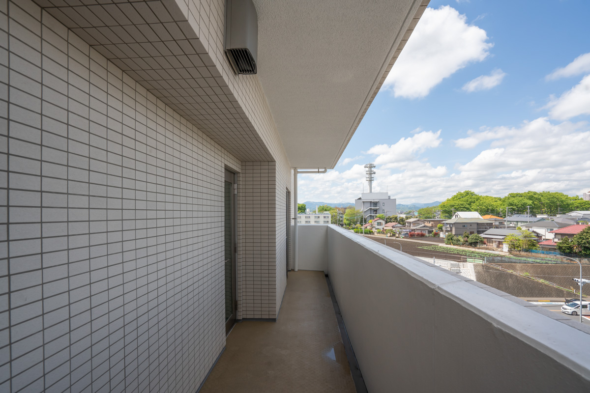 サービスバルコニーからは青空と街の緑、遠くの山々が眺められる