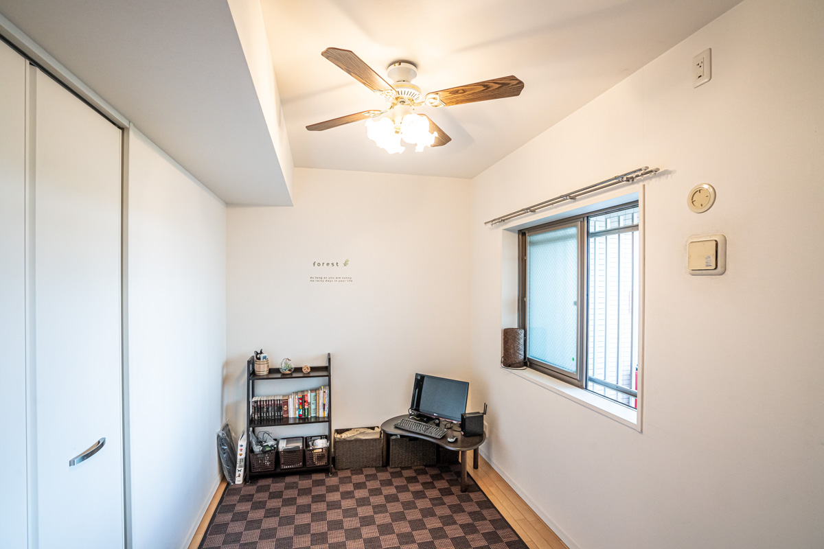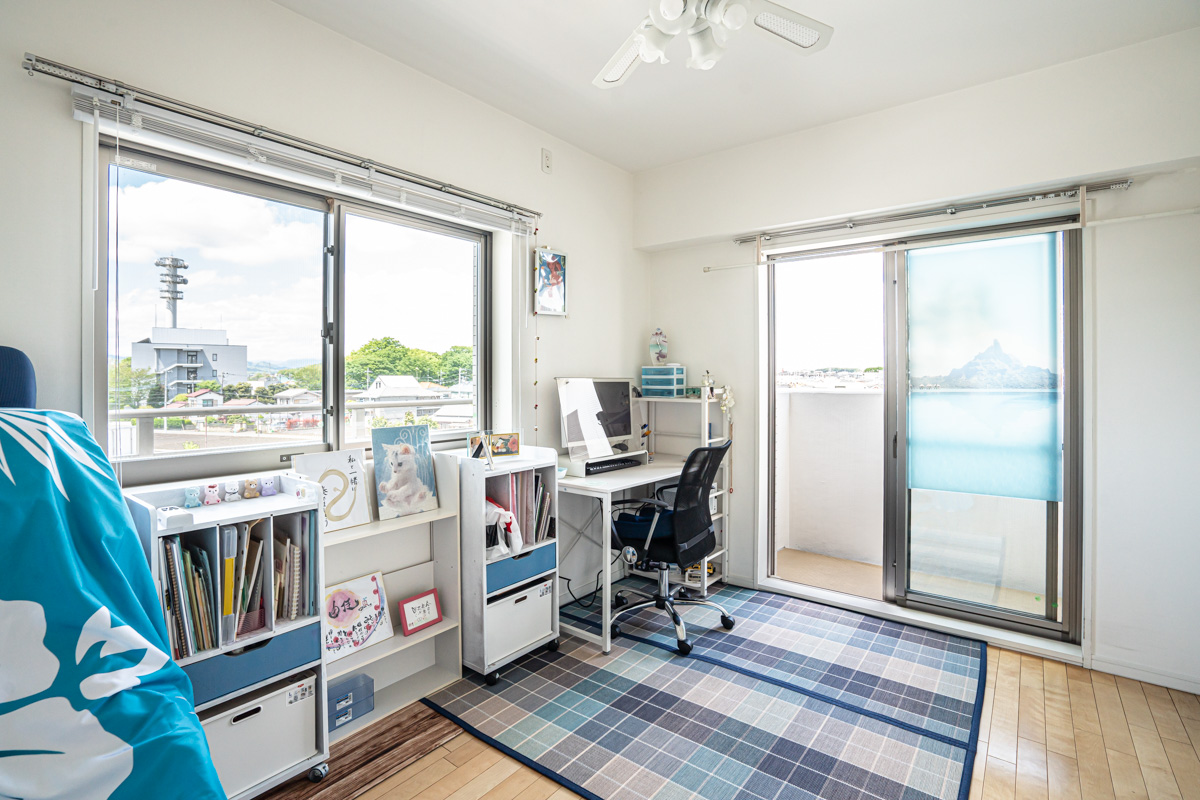 窓の多い角部屋を活かして、各個室全てに窓があるつくりにしています。家族が集まるリビングは広くするため、個室は明るさや風通しを確保しつつ、コンパクトなつくりに。ベッドとちょっとしたデスク、椅子がおける広さにしています。