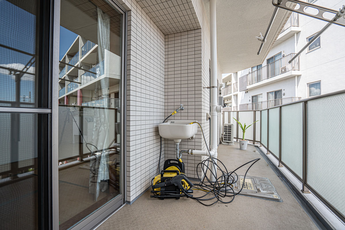 あれ、バルコニーに高圧洗浄機が出ていますね。水栓があるんですか?