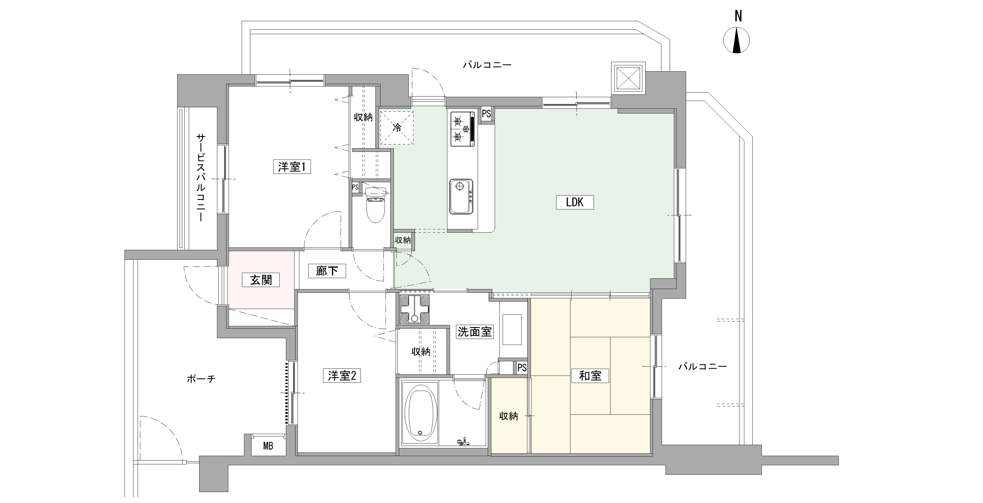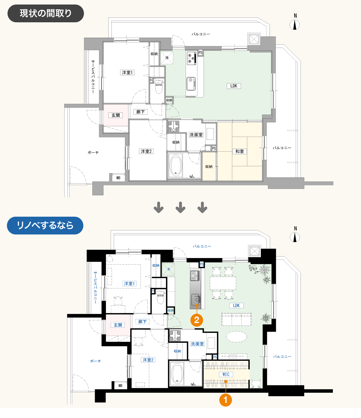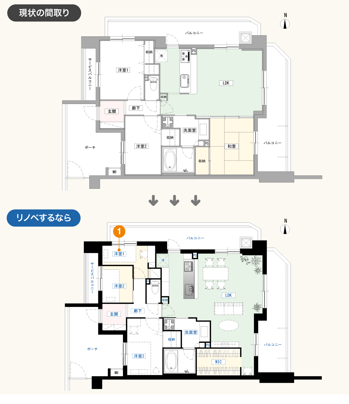 便利な環境で、自然に囲まれた生活も満喫できる魅力的な物件です。図面上は間取り変更しやすい構造なので、リノベーション向きといえます。角部屋のため、壁の断熱は検討したいところです。プロ目線で作成したリノベーションプランを、2つご紹介します。