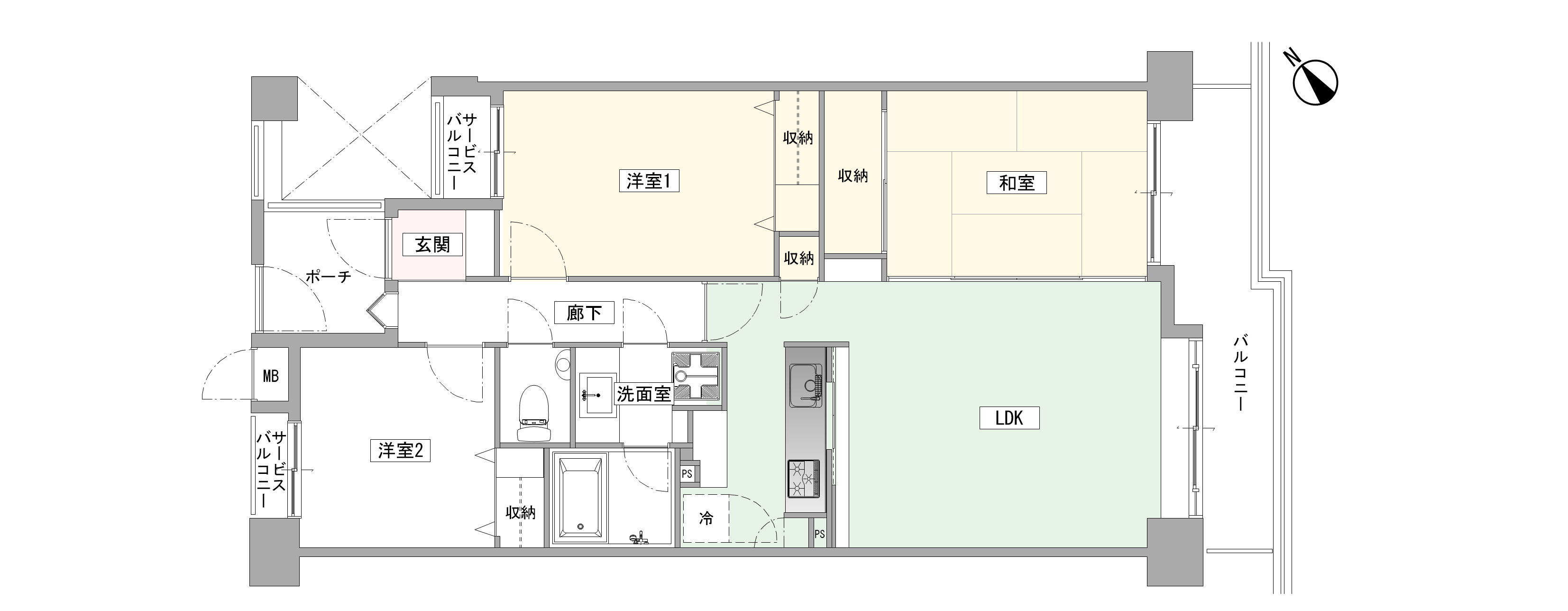 å°çªããã£ãŠæããçé¢ãå»äžãã2ã€ã®å宀ããã€ã¬ã济宀ããªãã³ã°ãžãšç¶ã