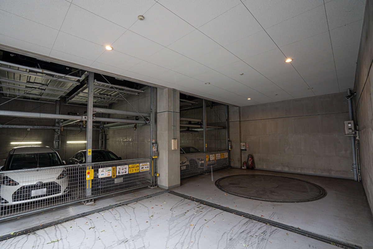 雨の日も便利な屋根付きの機械式駐車場。この横にゴミ集積所がある