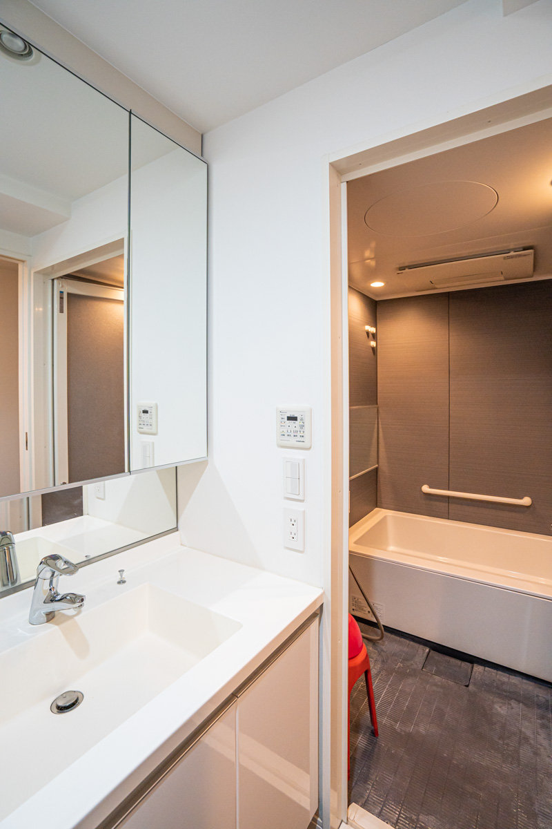大きな鏡がついて広々と入浴できるバスルーム