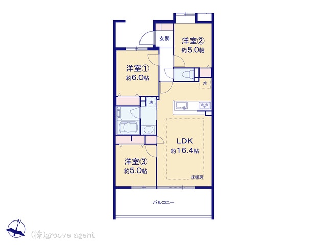 68.59㎡の3LDKは夫婦+子供1〜2人にちょうど良い広さです。南向き最上階で日当たり・風通しが非常に良く、バルコニー13.1㎡も付いています。床暖房がLDKに設置されており、冬場も足元から暖かく過ごせます。浴室乾燥機完備で雨の日の洗濯物も安心です。システムキッチン(W2400)、食洗機、追い焚き機能付き給湯器など、現代的な設備が充実しており、快適な日常生活を送れます。