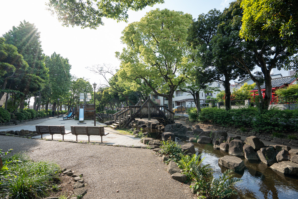 文化センターの裏手にある小松川境川親水公園は、小松川境川沿いに約4kmも続いています。滝あり、せせらぎあり、飛び石ありの大きな公園です。駅の向こうにある新小岩公園も歴史ある大きな公園で、桜の名所として有名ですよ。