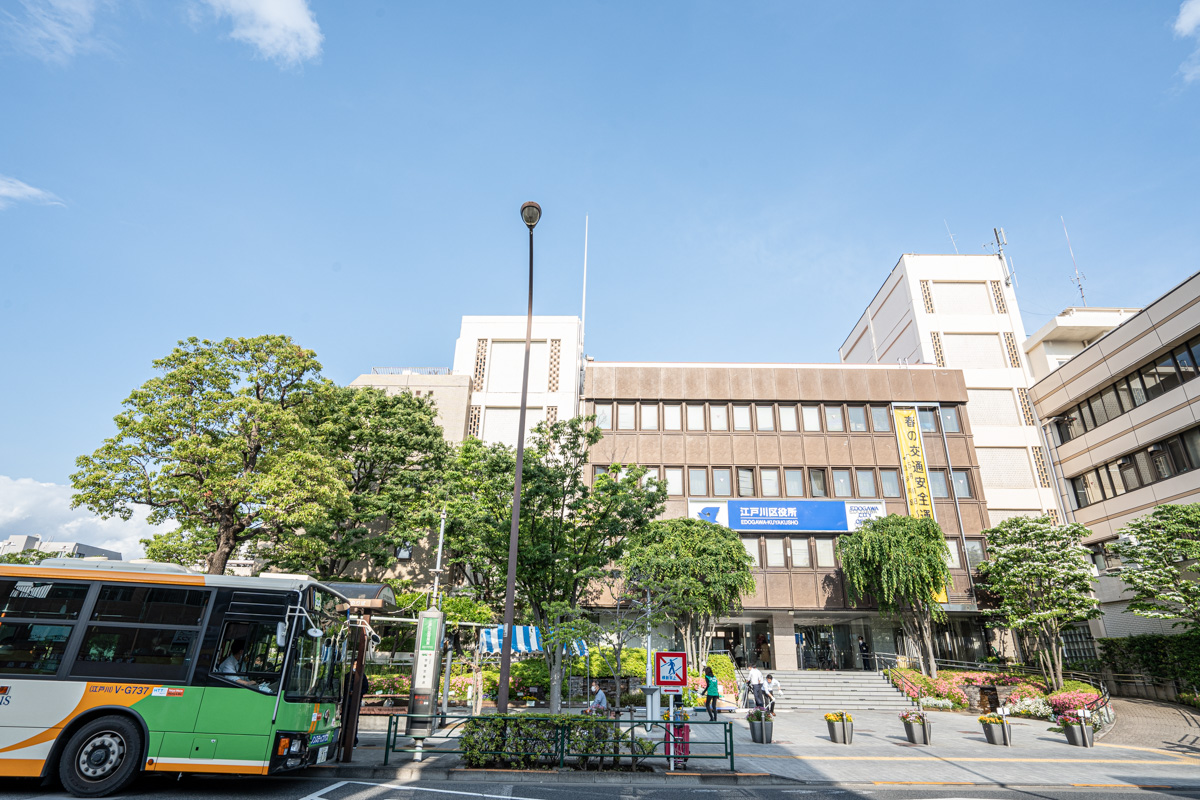 マンション周辺もとても便利です。新小岩駅から船堀駅へ向かう大通り(船堀街道)に、江戸川区役所や区立図書館、総合文化センターがあり、それと交差する京葉道路沿いには郵便局と警察署が並んでいます。コミュニティセンターもすぐそこ。江戸川区の主要な施設が集まっているところなんです。