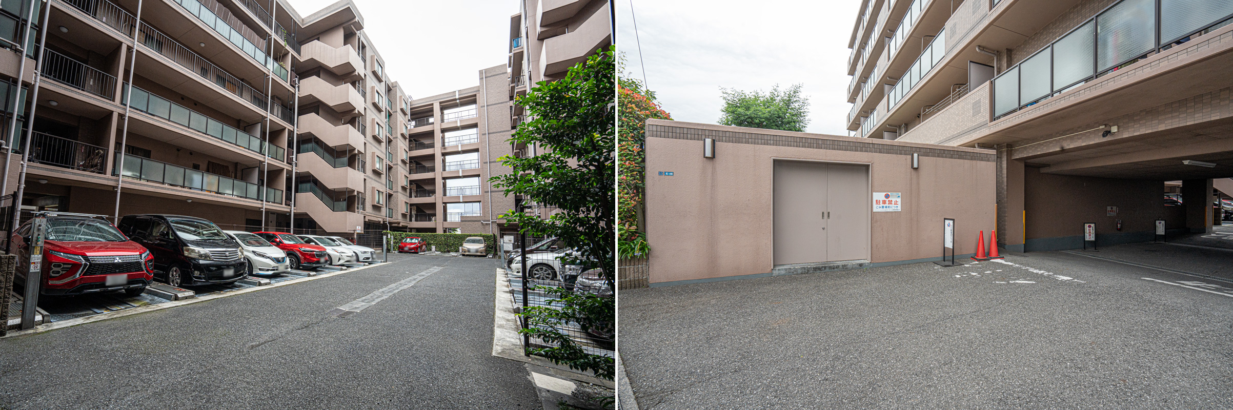 台数が置ける広い駐車場と駐車場入口付近に設けられたゴミ集積所