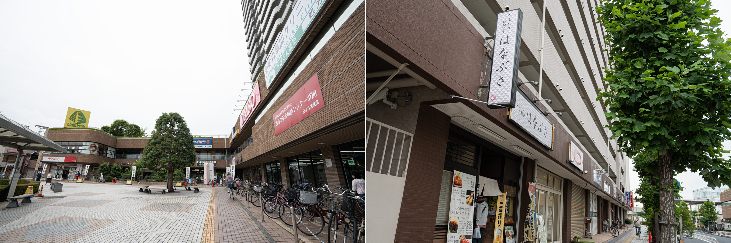 左/いなげやなどの店が並ぶ谷塚駅前