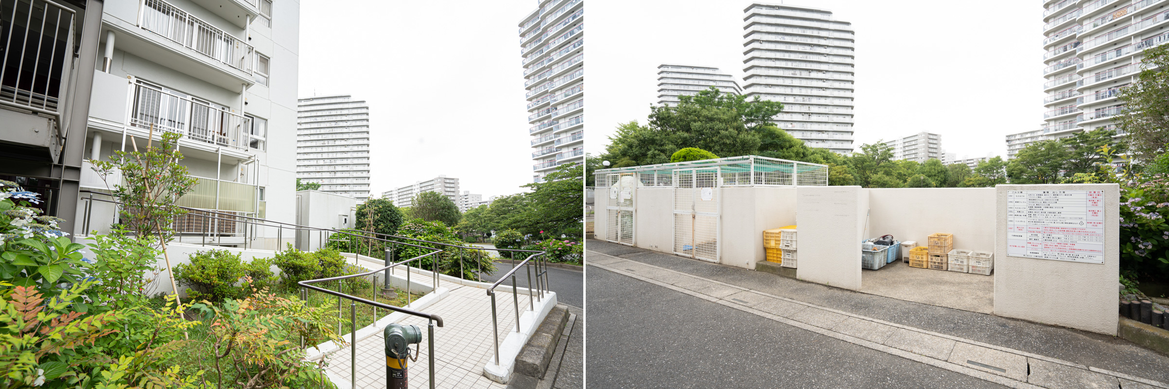 緑の景観とマッチした美しいスロープ。ゴミ集積所は大きくて使いやすい