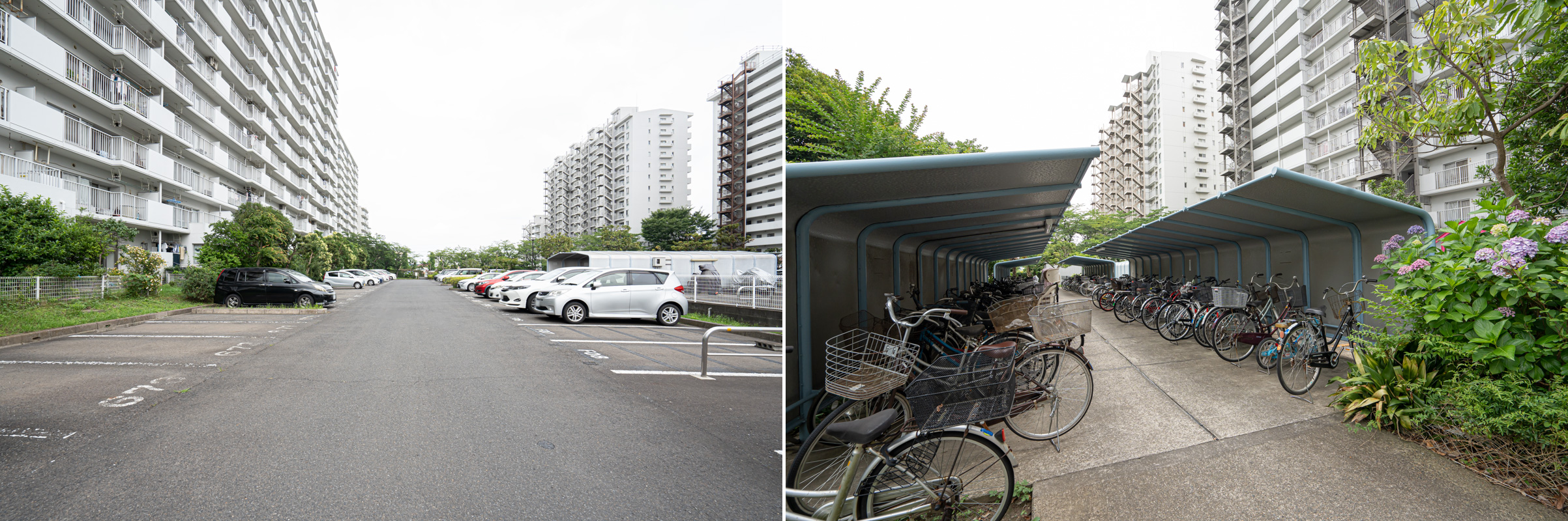 マンションエリアの中央が大きな公園になっていて、各建物の管理人さんの詰所が設置されています。朝になると管理人さんがそこから各建物に仕事に行き、細やかに清掃してくれています。駐車場は平置きですぐに道路に出られて便利。付近に月極駐車場もたくさんありますよ。