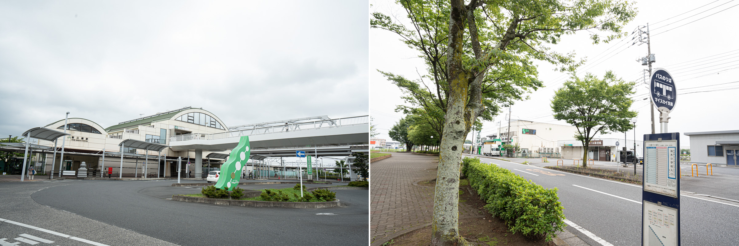 徒歩圏内の新三郷駅。マンション前のバス停からは三郷中央駅行のバスが出ている