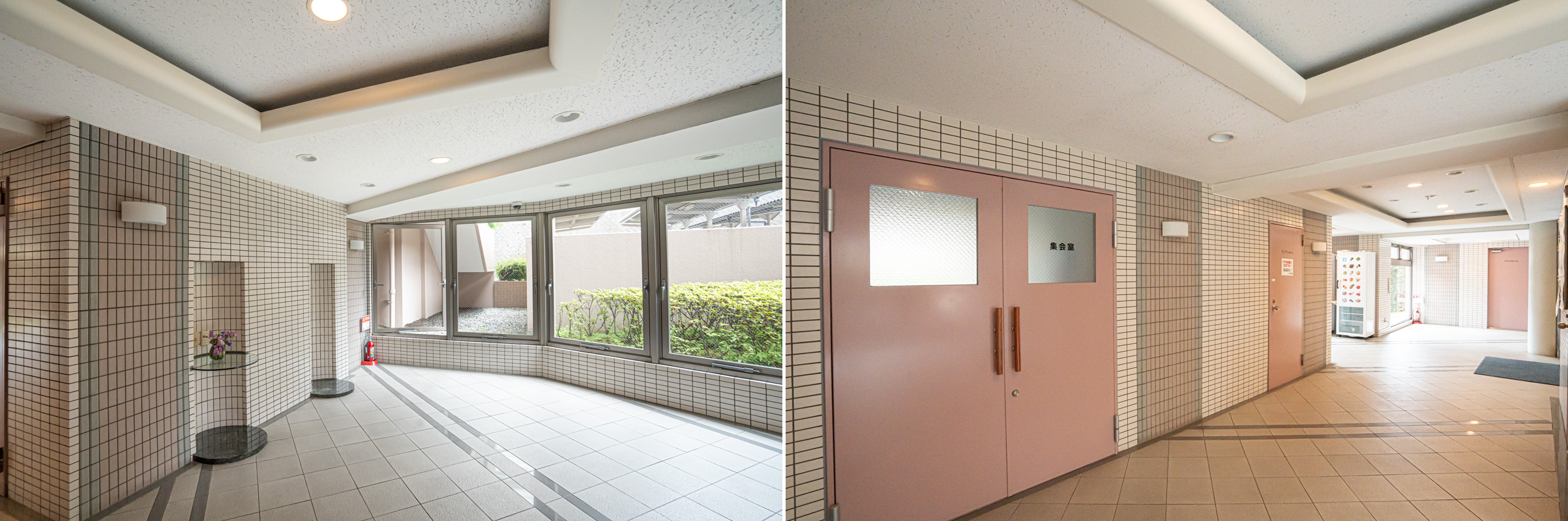 美しい緑がのぞめる広いエントランスホールには集会室も