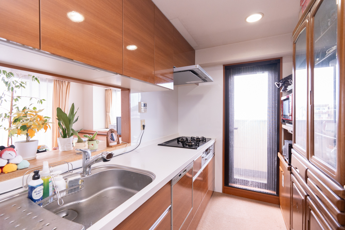 大きな窓から風が通り抜ける開放感あふれる対面キッチン。調理中も快適、家族との会話が自然と弾む設計◎