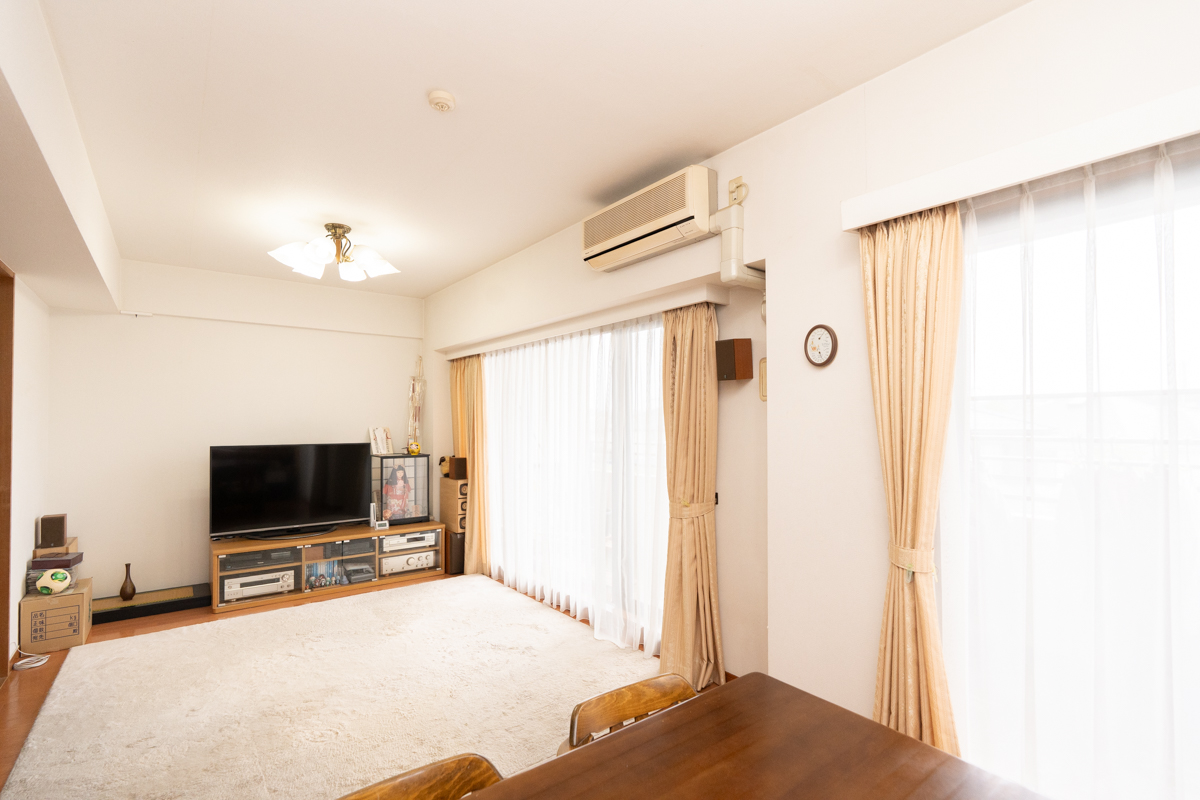 南からの光がやさしく差し込む、広々とした寛ぎ空間。床暖房完備で、冬の朝も快適に過ごせる安心のぬくもり