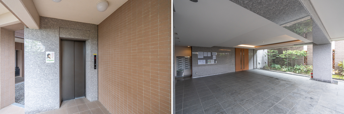 毎日を迎えてくれる、高級感のある美しいエントランス(写真右)。共用部まで丁寧に手入れされた、清潔で気持ちいい空間