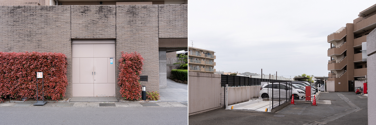 24時間ゴミ出し可能(写真左)。駐車場は立体式で、駐車場の奥には駐輪スペースがある