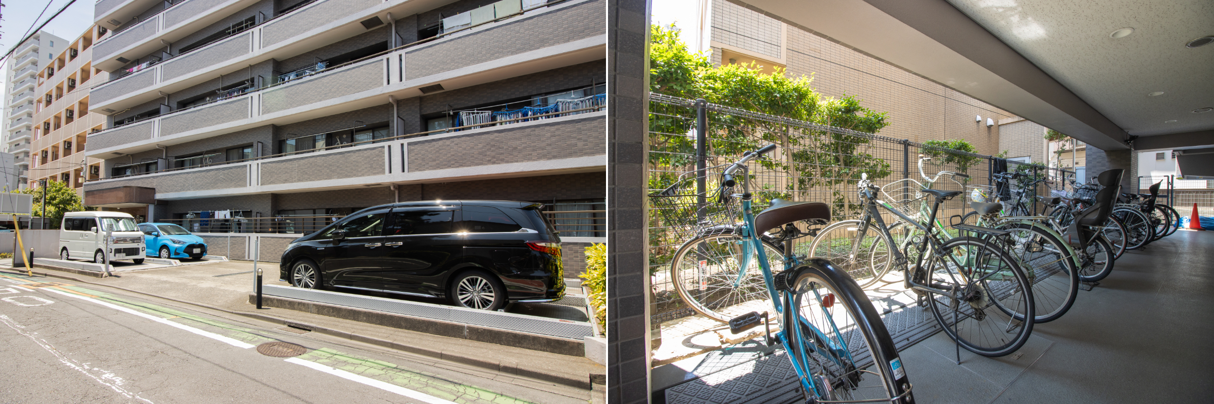 建物前に立体駐車場、敷地内に2箇所の駐輪場がある