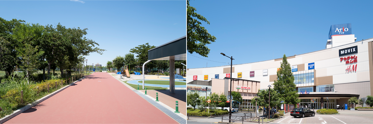 小菅東公園では日本庭園、芝生広場、テニスコート、遊具などが楽しめる。アリオ亀有はマンションから車で10分