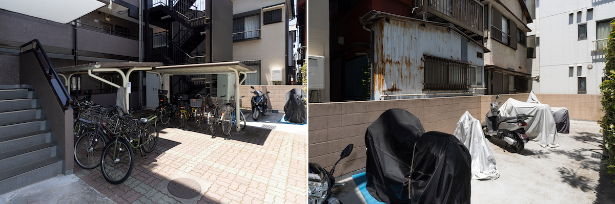 駐輪場は屋根付き。バイク置き場も完備