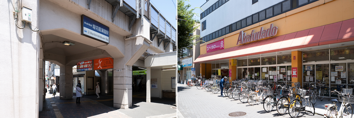 最寄りの堀切菖蒲園駅はマンションから徒歩6分。駅前には大型スーパーの赤札堂がある