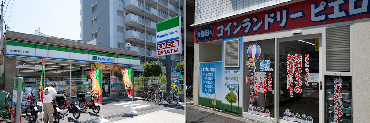 道路の向かいにはファミリーマート、コインランドリーも徒歩1分以内にある