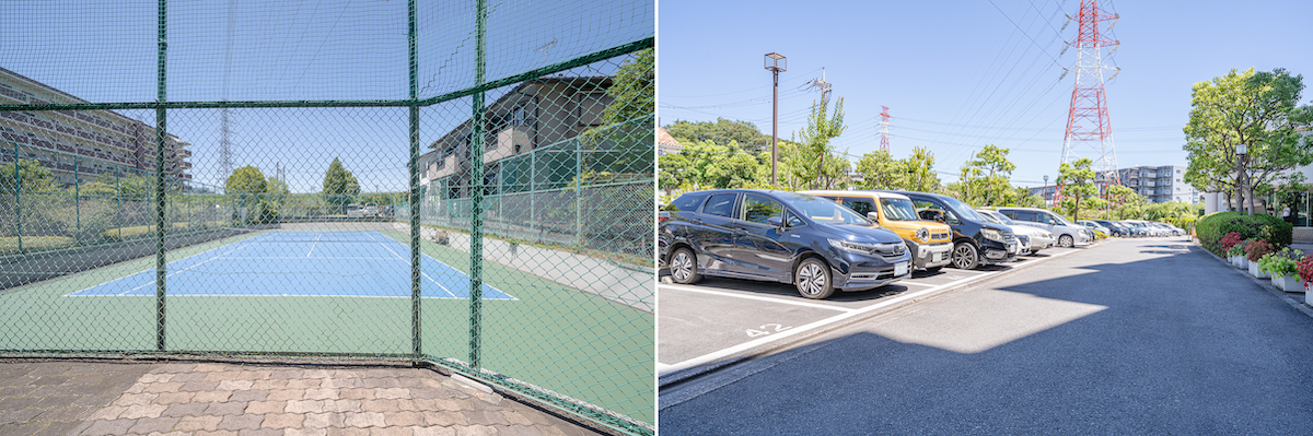 敷地内には住人専用の広々としたテニスコートがある。駐車場は平置きタイプ
