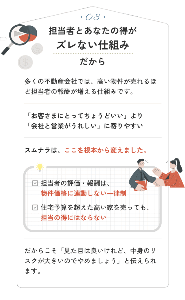 その後、実際に物件の売買をお手伝いする際に、法律で定められた範囲内の仲介手数料を頂きます。 担当の評価は物件価格で変わらないので、住宅予算を超えた高い家をすすめるインセンティブはありません。