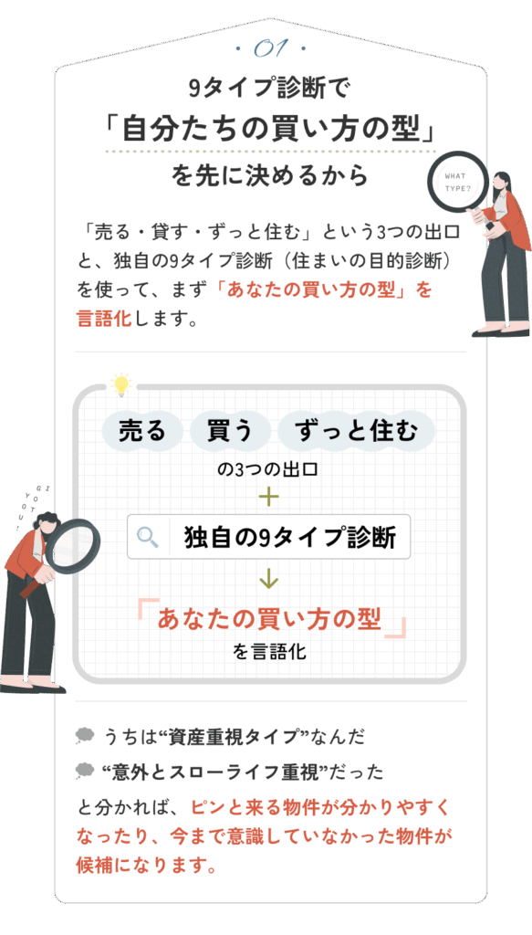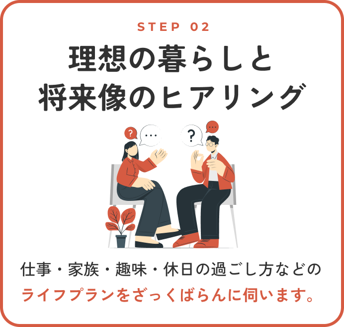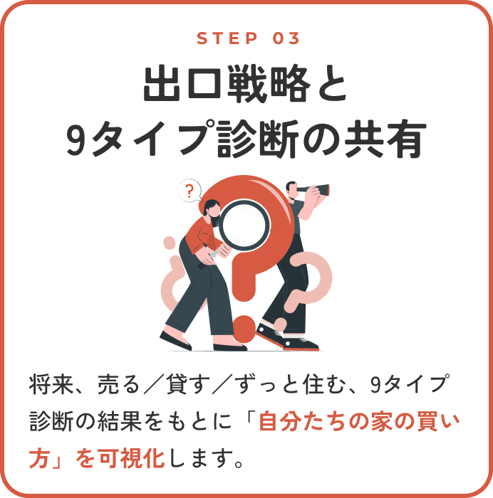 ライフプラン・お金・理想の暮らしについてお話を伺い、出口戦略と9タイプ診断結果を整理します。