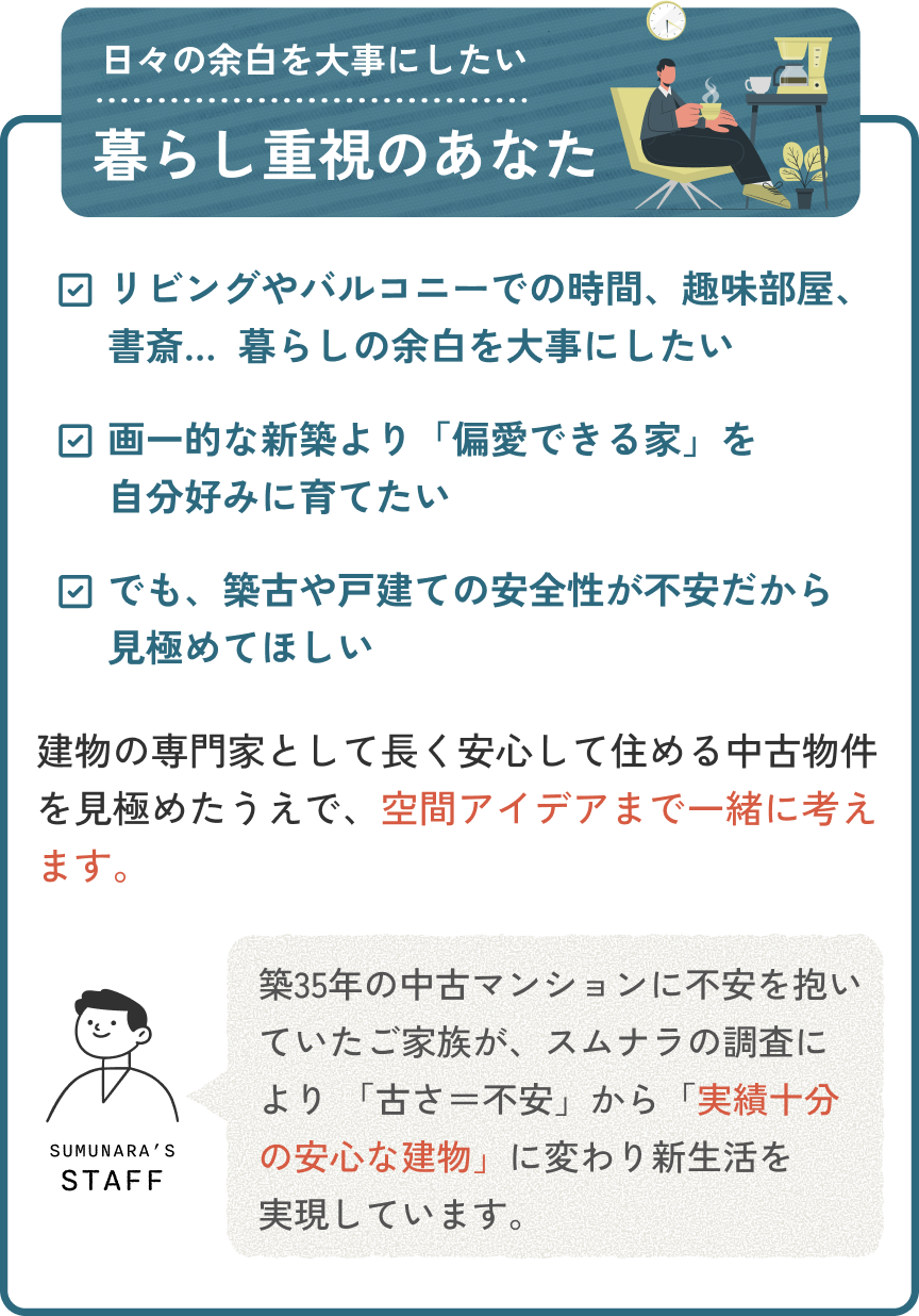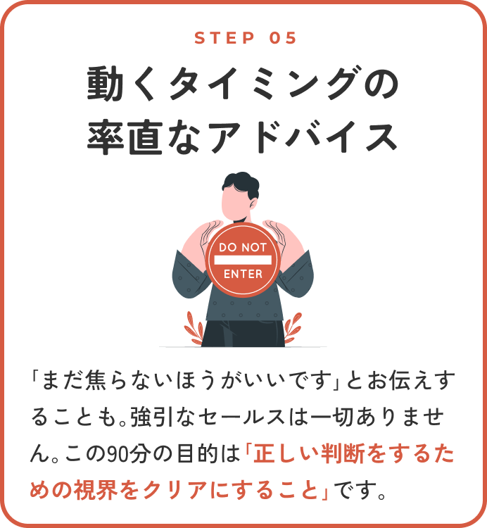 内覧、資金計画、リノベ相談など、納得してから次のステップへ進みます。全てあなたのペースで決められるから安心。よくある強引な営業は一切ありません。