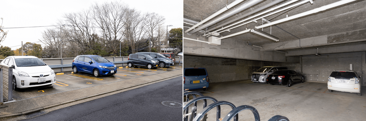 駐車場は屋内と屋外の平置きタイプ