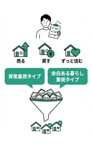 将来、この家を売る/貸す/ずっと住むのどれが軸になりそうか、さらに9タイプ診断の結果をもとに「自分たちの家の買い方の型」を可視化します。